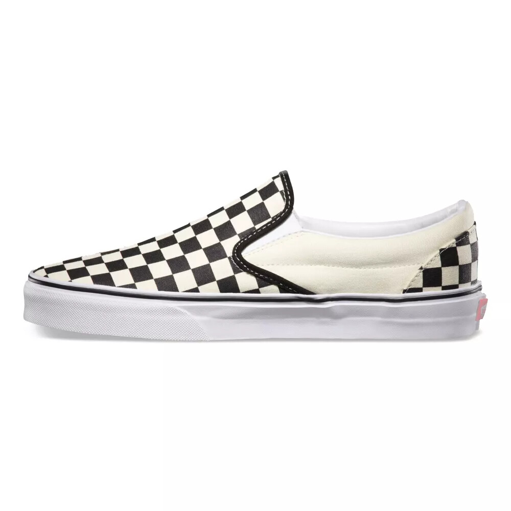 Vans The Classic Slip-On has a low profile, slip-on canvas upper with all-over checker print, elastic side accents, Vans flag label and Vans original Waffle Outsole.