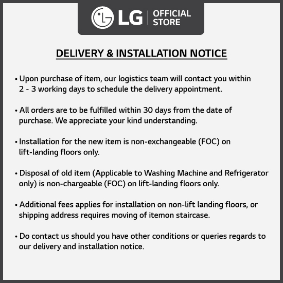 • Disposal of old item (Applicable to Washing machine and Refrigerator only) is non-chargeable (FOC) on lift-landing floors only.
