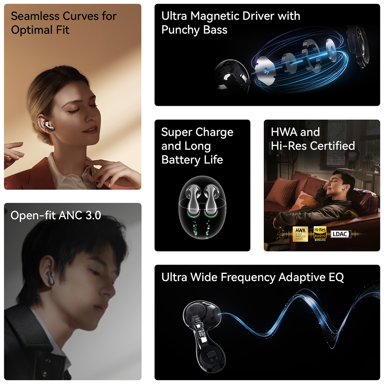 - Ultra Wide Frequency Adaptive EQ | HUAWEI FreeBuds 5 adjusts the sound by accounting for fit, wearing status, and volume level — all the way from 100 Hz to 2000 Hz4 — to provide a personalised listening experience full of passion and pizzazz.