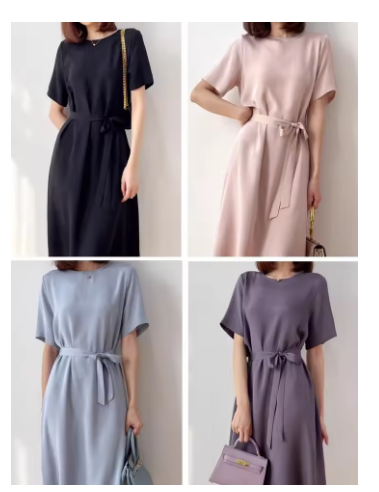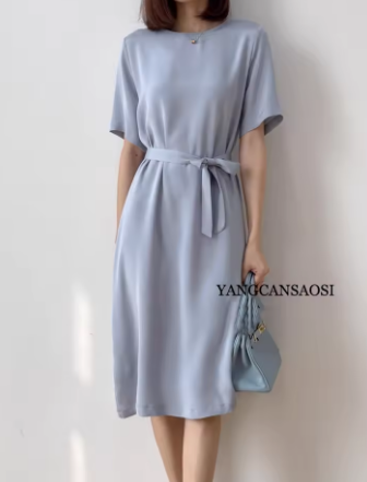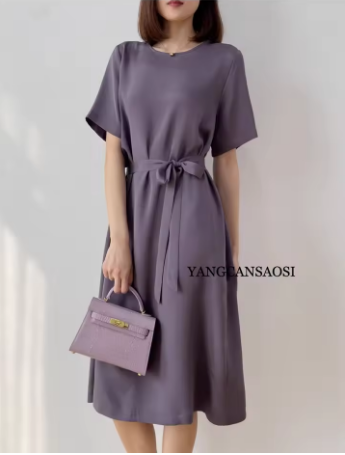 26mm 93% natural mulberry is made of 7% spandex silk elastic heavy crepe fabric, which has a good texture, matte luster, and is comfortable and skin friendly. Round neck, short sleeves, with a waist belt. A solid color dress, elegant and gentle.