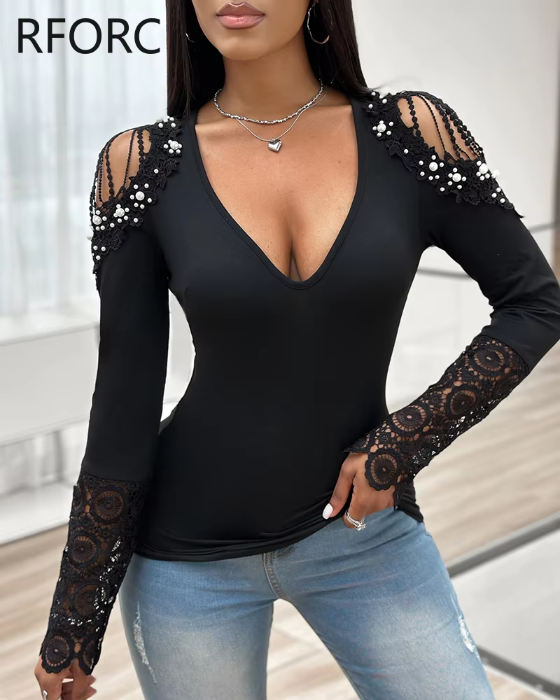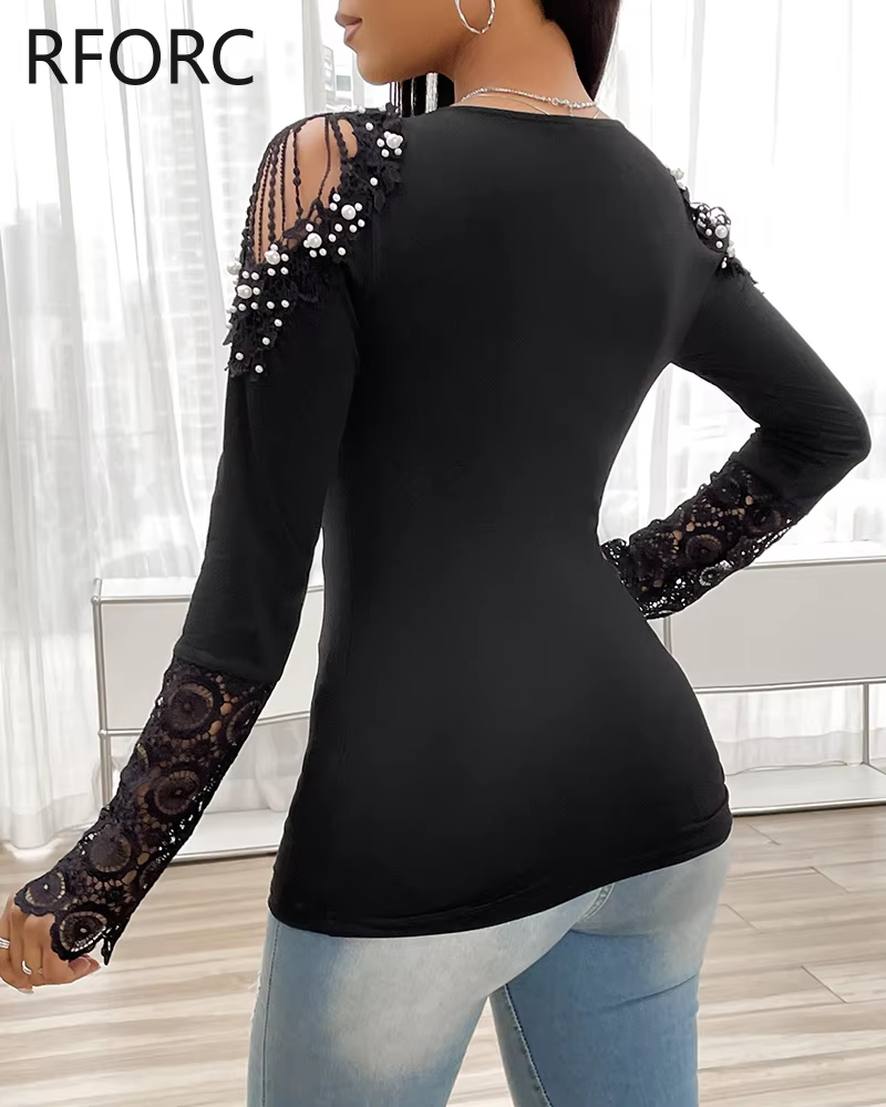 2024 Women Long Sleeves Beading Decoration Hollow Out Lace Patch Casual Basic Knitting Blouse Top