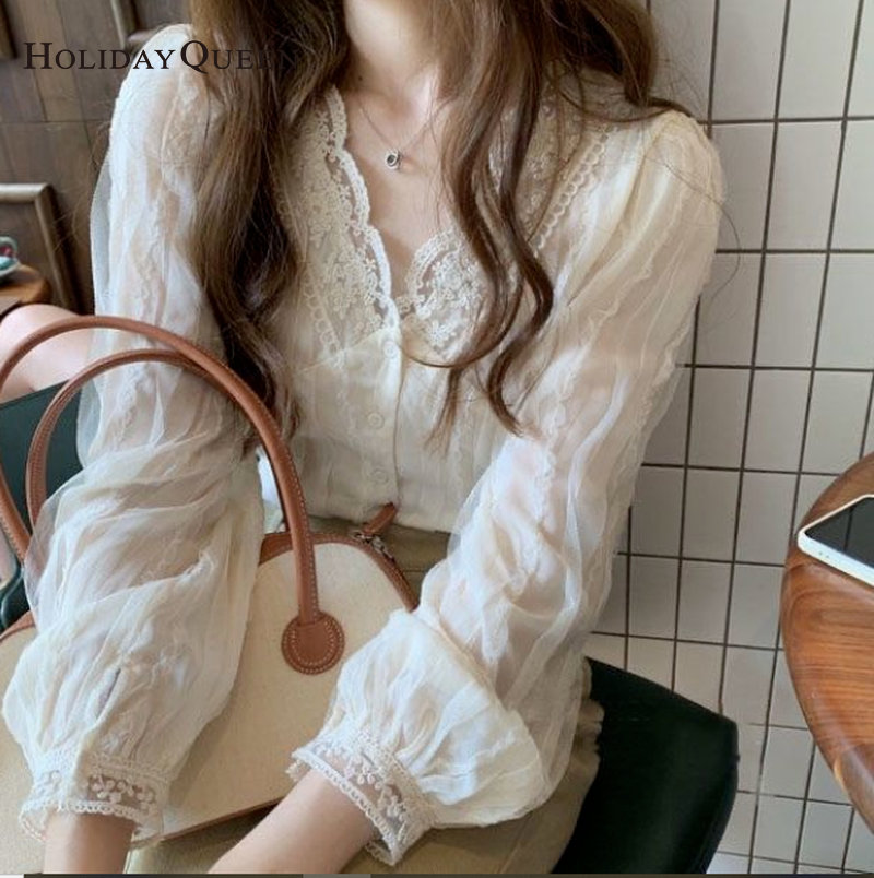 HolidayQueen 2021 Women's Autumn Wear V-neck Long-sleeved French Temperament Gentle Chiffon Shirt Sweet and Chic Small Shirt Fashionable All-match Blouse S M L XL 2XL Free Shipping HQ0564