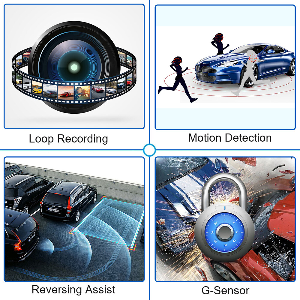 **Basic Features: Front Cam 4K, Rear Cam 1080P, G-Sensor, Cycle Recording, Motion Detection, Time&Data Display, Wide Dynamic Range, GPS Navigation, Parking Assist