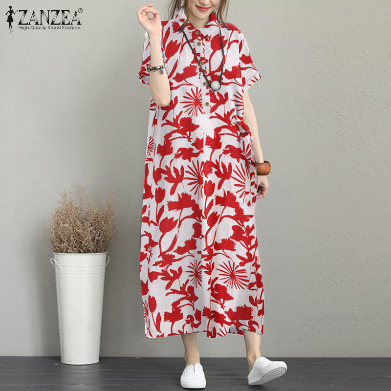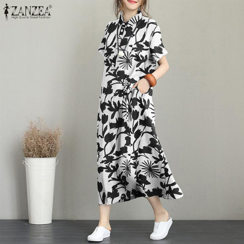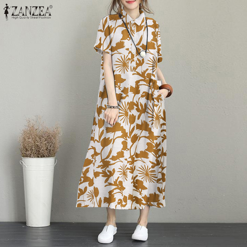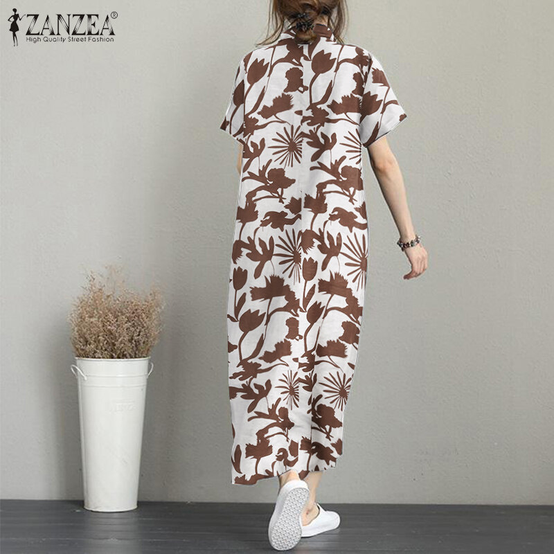 ZANZEA Women Summer Short Sleeve Baggy Long Dress Floral Printed Maxi Shirt Dresses