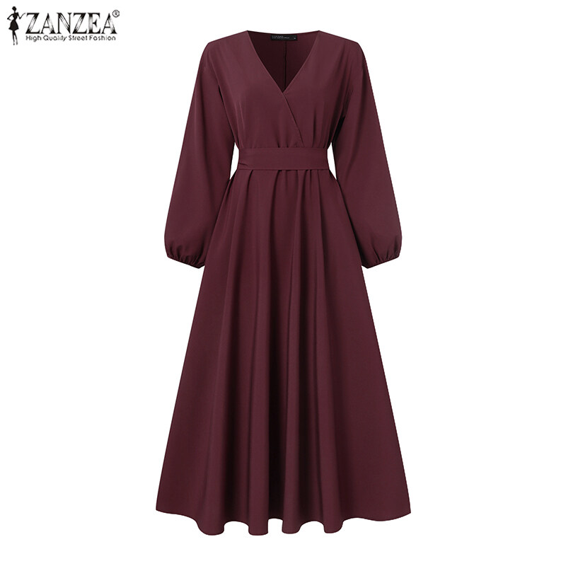 ZANZEA Womens Puff Long Sleeve V Neck Plain Fashion Party Evening Swing Maxi Dress #11
