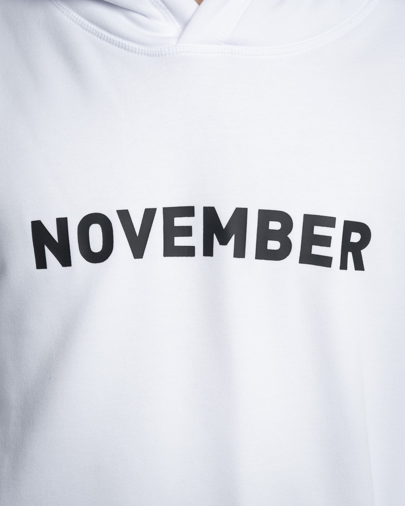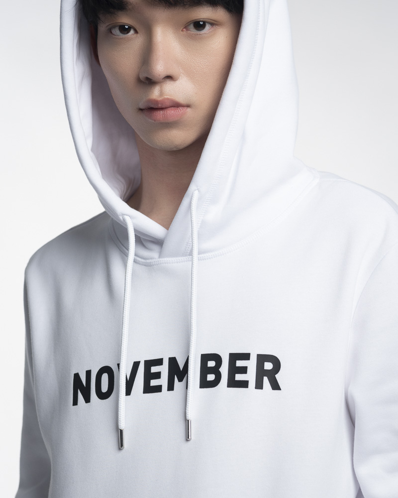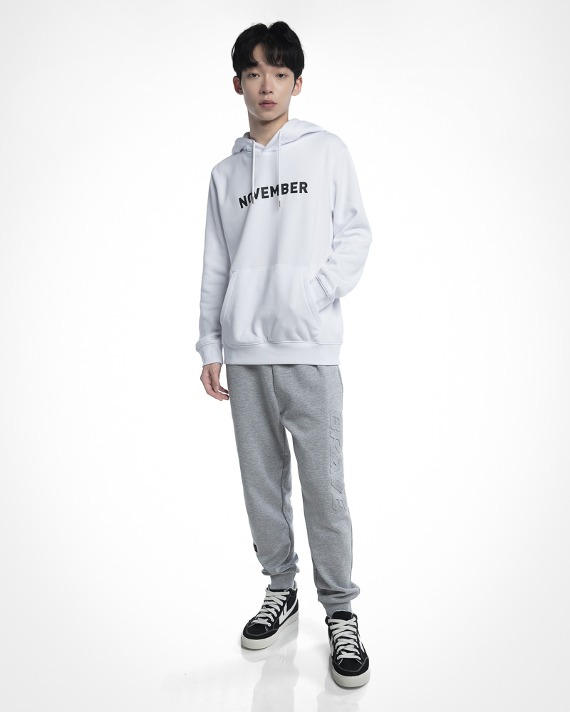 Yishion Men Solid Coloured Long Sleeve Hoodie with Kangaroo Pockets and November Slogan (White)