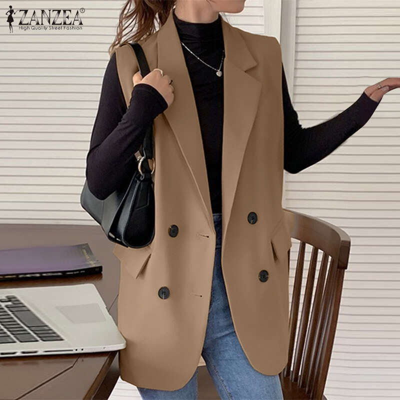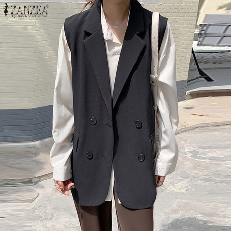 ZANZEA Korean Style Women Commute Turn-Down-Collar Sleeveless Blazer Double-Breasted Solid Vests #10
