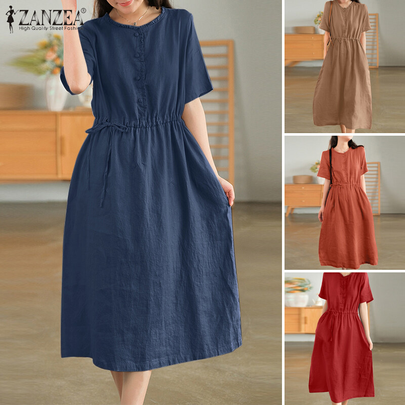ZANZEA Korean Style Women Short Sleeve A Line Long Dress Cotton Linen Plain Oversized Swing Dresses #8