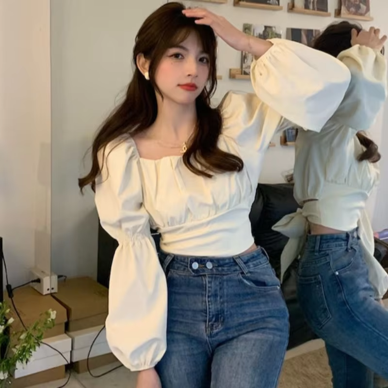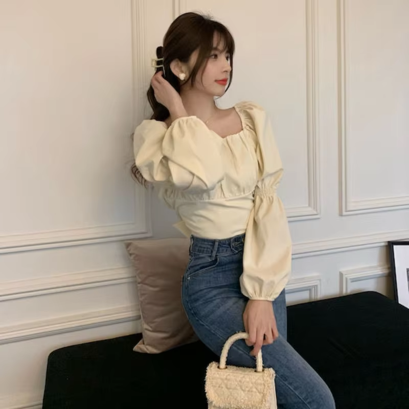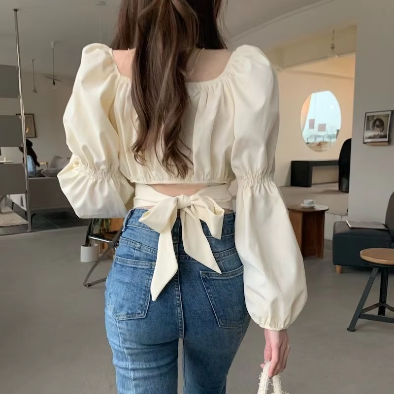 Back-bow Blouses Women Spring Chic Cropped Simple Solid Hot Sale Feminine Korean Style Leisure Streetwear Basic Mujer Blusas Ins Size:S M L XL Style:Korean style Season:spring autumn summer winter Color:apricot Gender:women/female/lady Product Category:women blouses