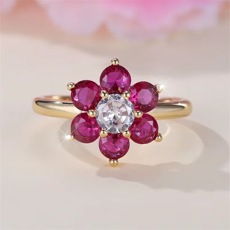 Charm Cherry Flower Rings For Women Rose Red Stone Cocktail Ring Wedding Bands Antique Gold Color CZ Engagement Party Jewelry