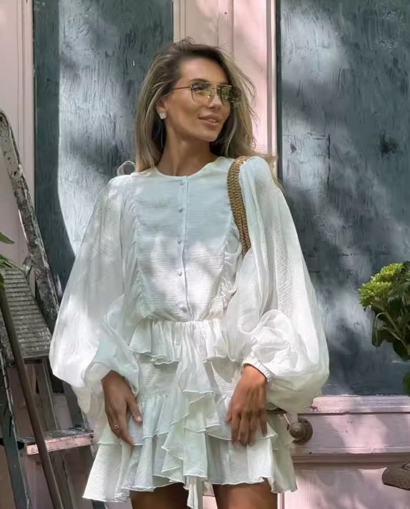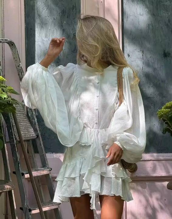 Chic Round Neck Full Sleeve Mini Dress Elegant Solid Layered Curling Edge Single-breasted Gown New Lady Highstreet Dresses 2025