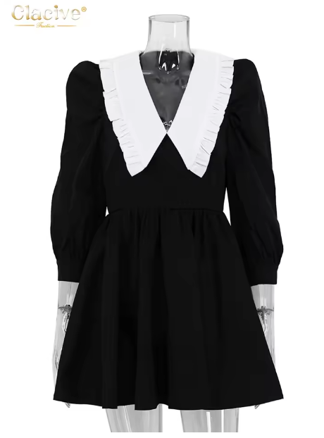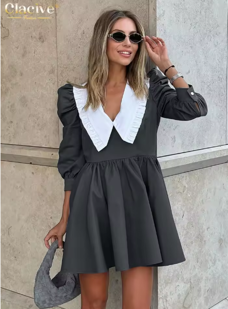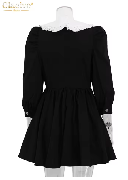 Clacive Fashion Black Patchwork Office Women Dress Casual Lapel Long Sleeve Mini Dresses Elegant High Waist Pleated Female Dress