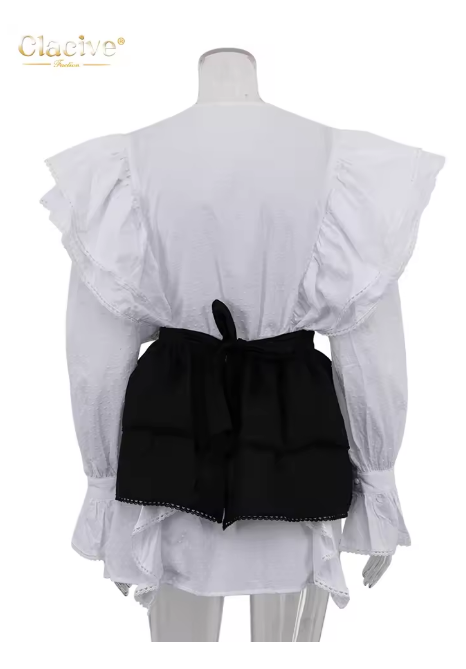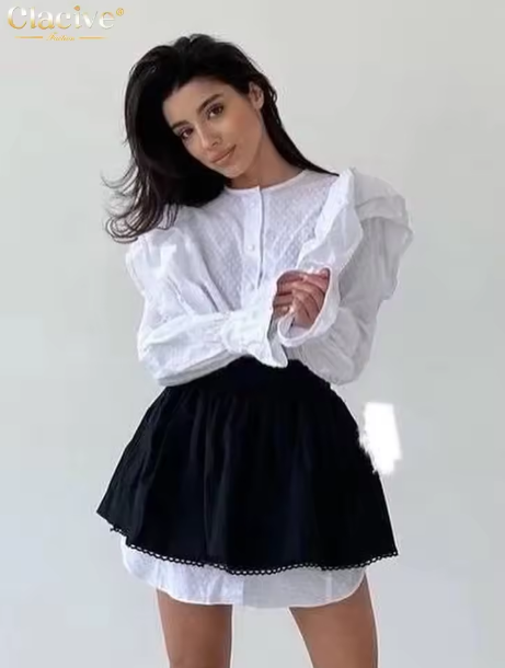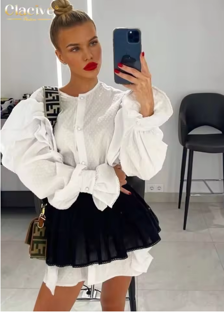 Clacive Fashion Loose White Cotton Dress Ladies Casual O-Neck Long Sleeve Mini Dress Elegant Classic Pleated Dresses For Women