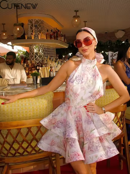 Cutenew Halter Lace Up Sweet Women Mini Dress Sexy Backless Ruffle Stacked A-line Bodycon Female Fashion Princess Party Vestidos