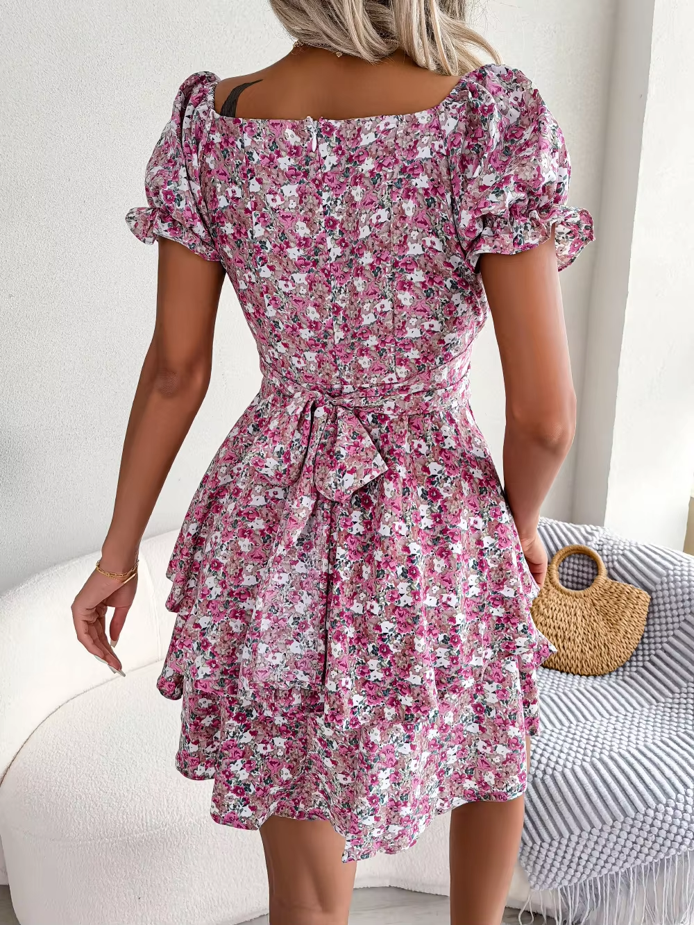 Dress For Women Summer Temperament, Sexy Square Neckline, Floral Pattern, Waist Cinching, Big Swing, Short Skirt Dress For Women