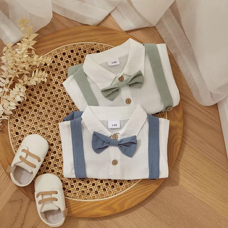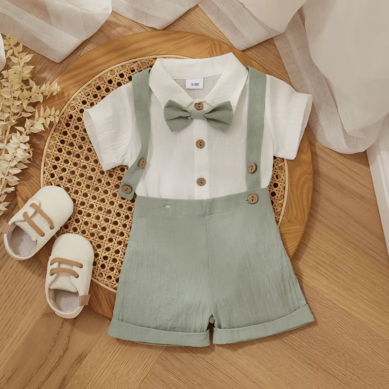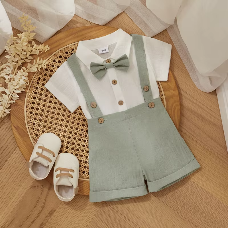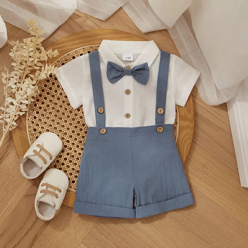 Fashion Summer Baby Boy Clothes Toddler Gentleman Outfits Short Sleeves Romper with Bow Tie Overalls Shorts Set for Formal Wear