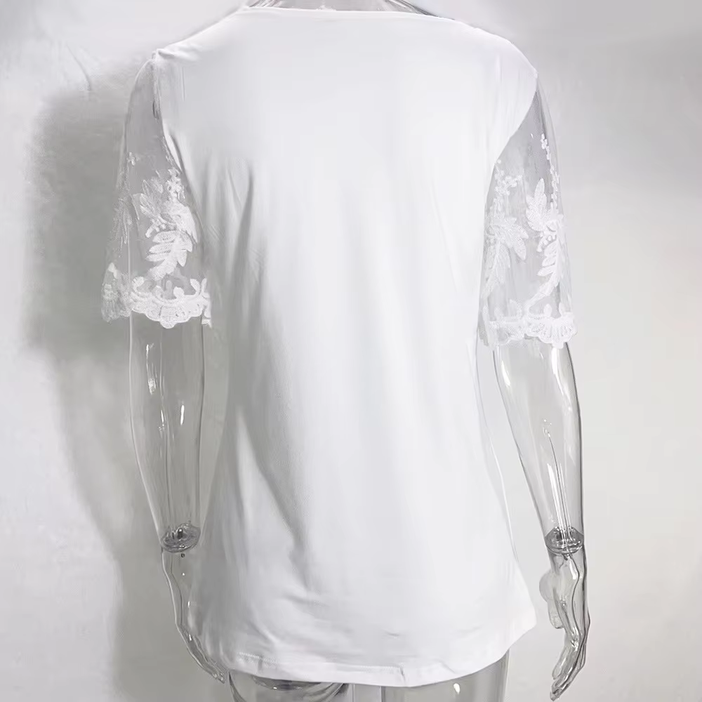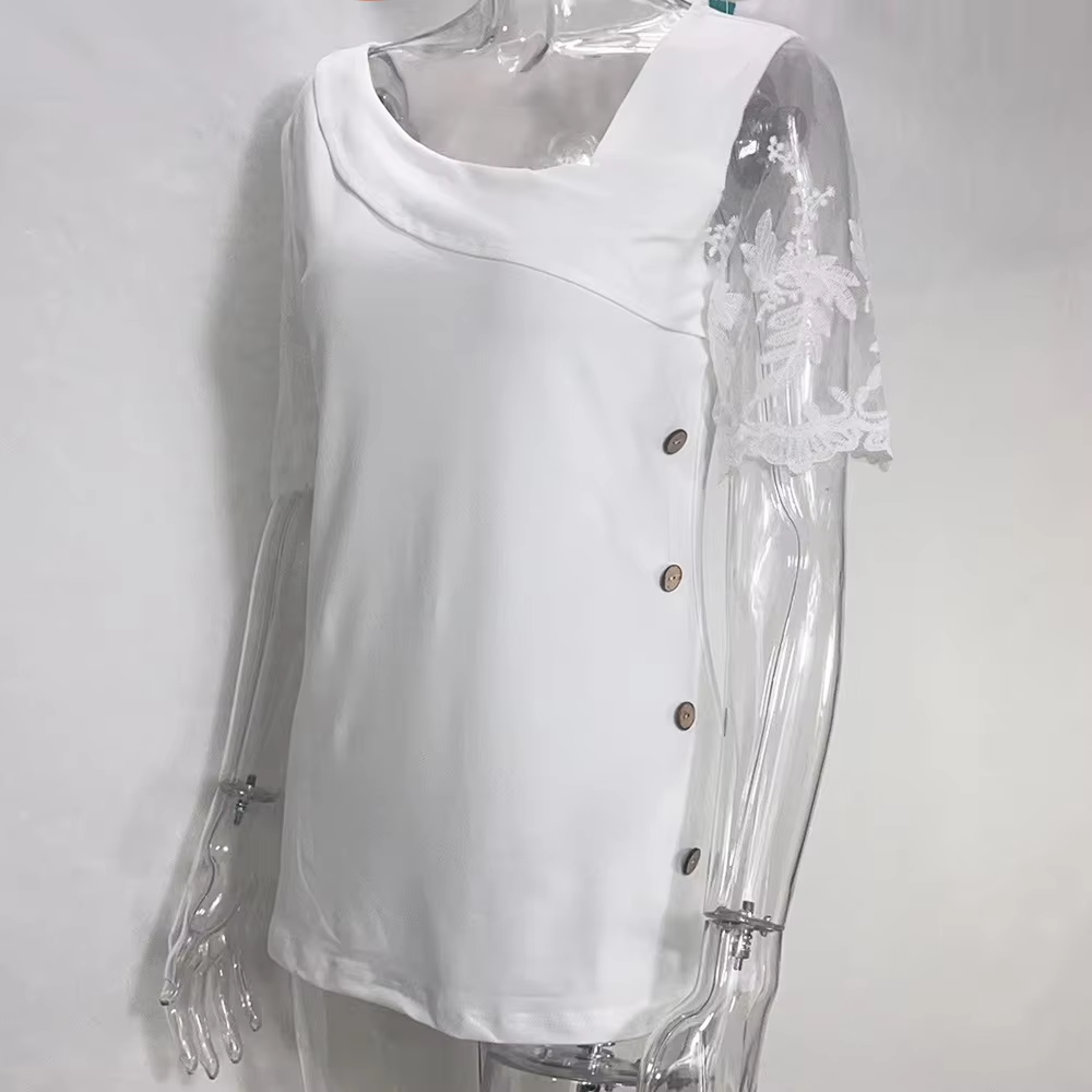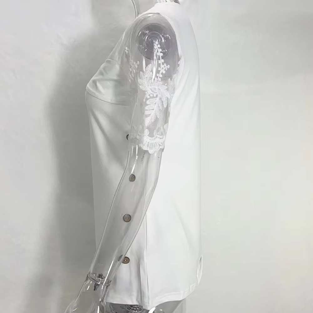 Fashion White Lace Short Sleeve Tops Women T Shirt 2023 Summer Casual Buttons Office T-shirt Tshirt Top Femme