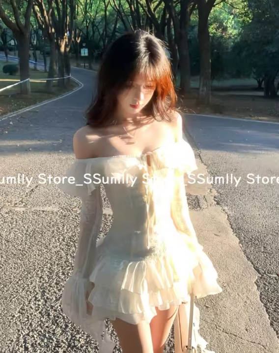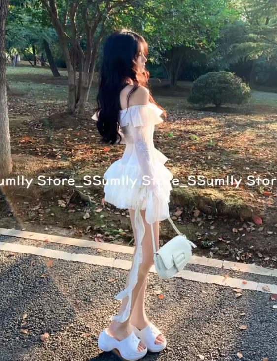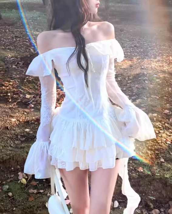 France Sweet Off Shoulder One Piece Dress Women Elegant Sexy Slim Party Clothes Female Korean Chic Design Fairy Dresses 2025 New