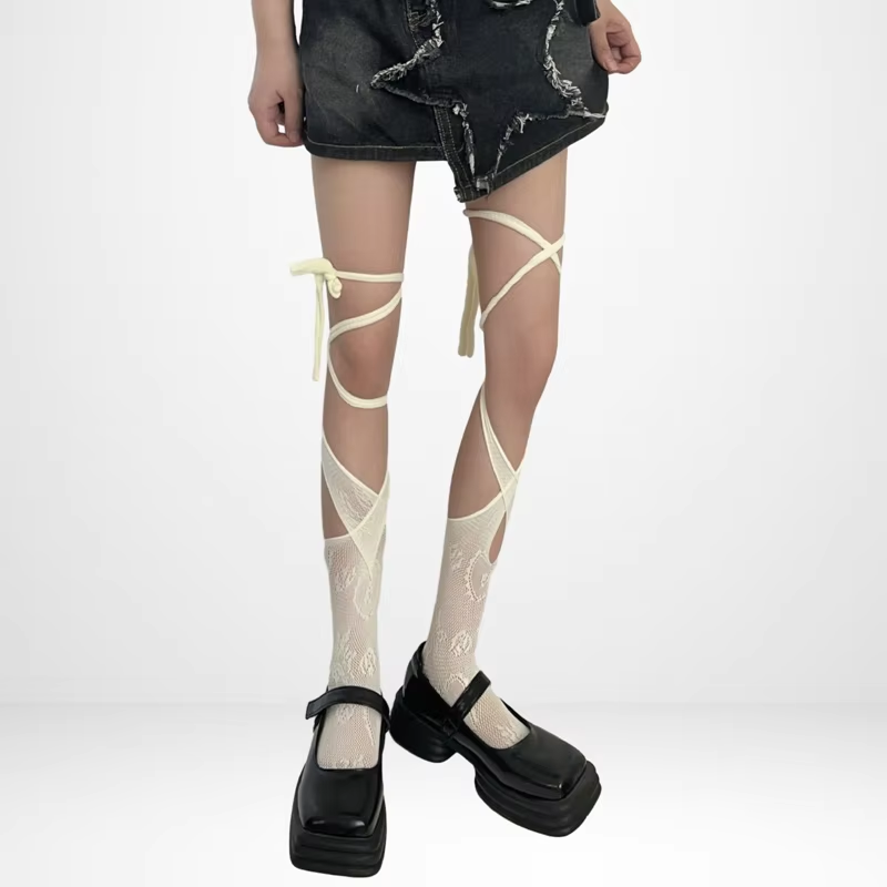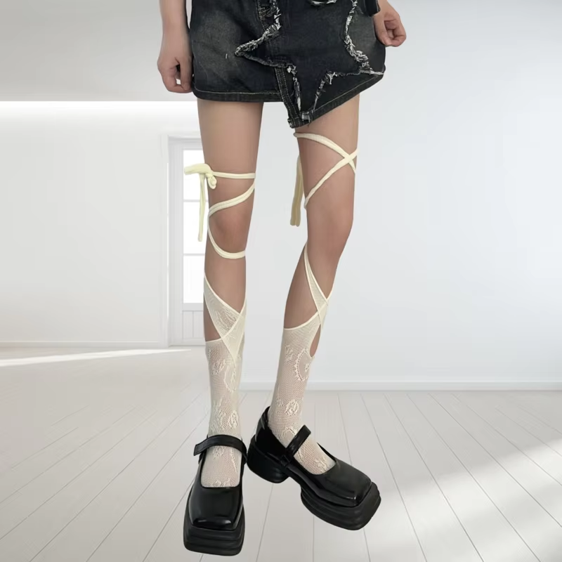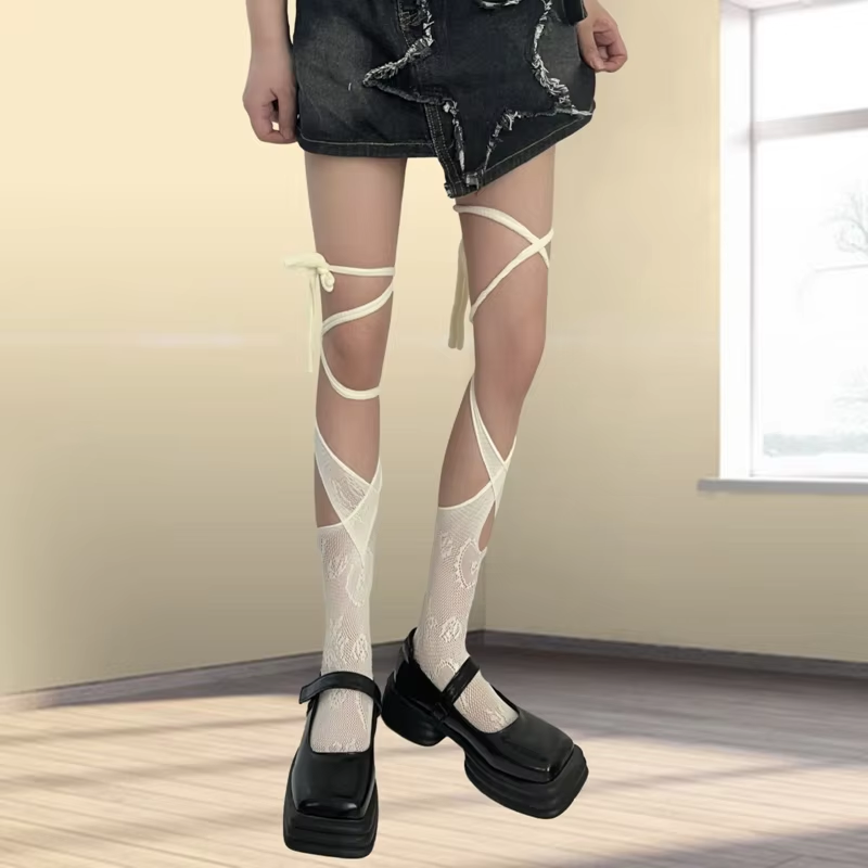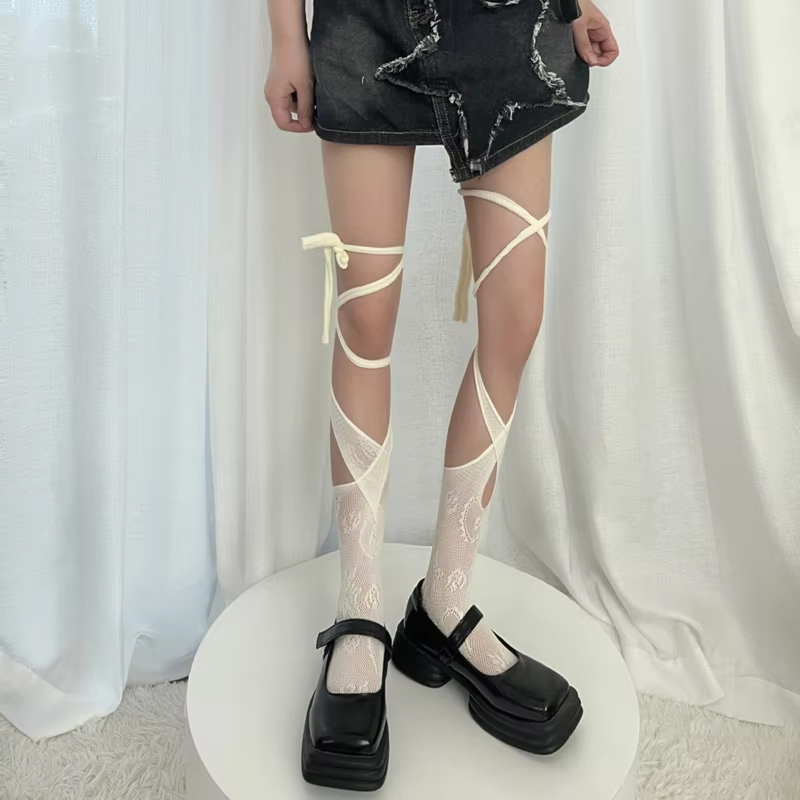 Gaono Women Arbitrarily Bandage Heart Floral Lace Fishnet Stockings Irregular Calf Socks Jk Tie Middle Tube Japanese Long Socks
