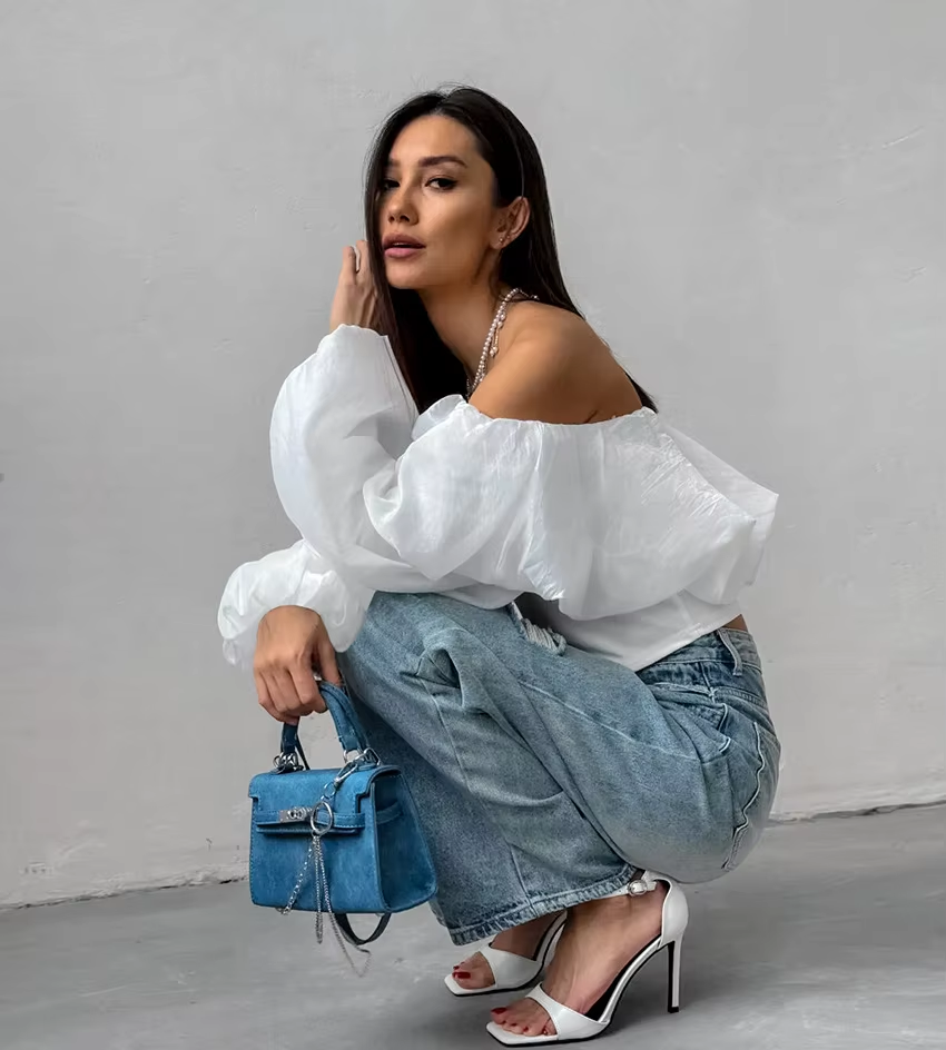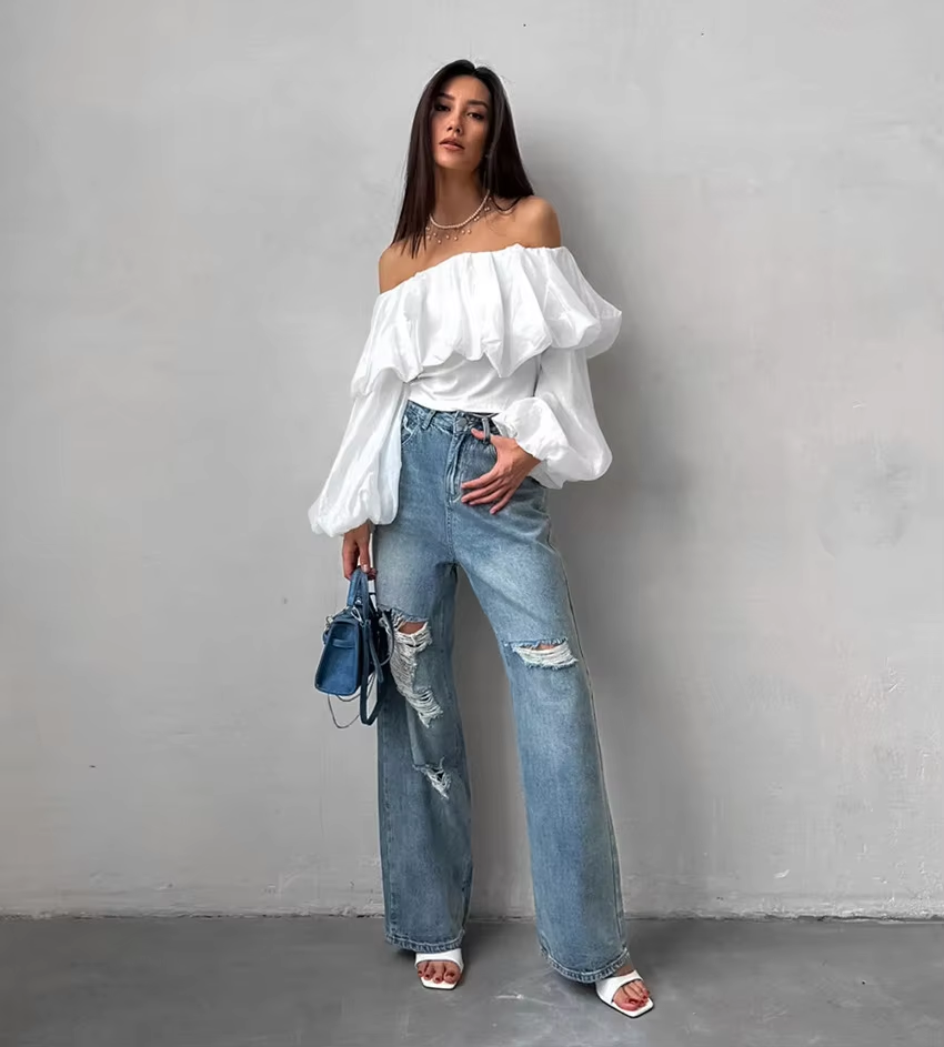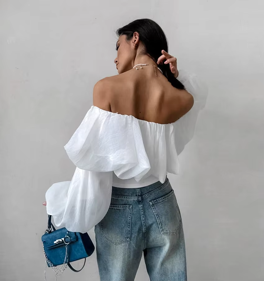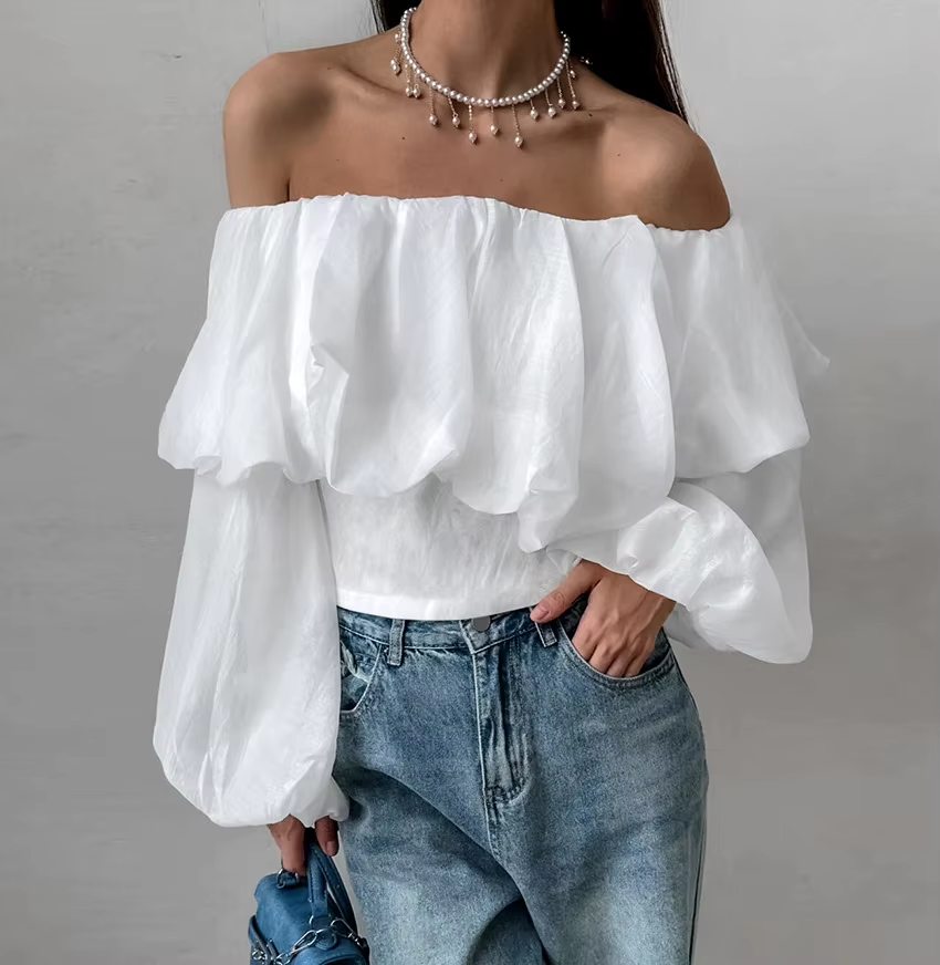 GetSpring Women Blouse 2024 Summer Slash Neck Off Shoulder Puff Sleeve White Shirt Fashion Loose Casual All Match Female Tops