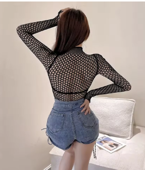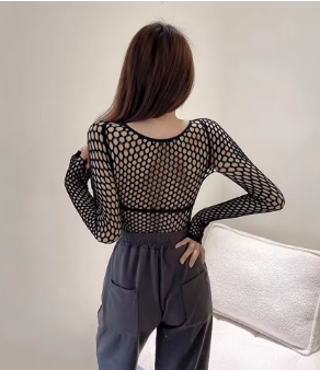 Gothic Sexy Black Fishnet Mesh See Through T-Shirt Women Skinny Goth Hollow Out Long Sleeve Shirts Crop Top Tee Shirt Streetwear