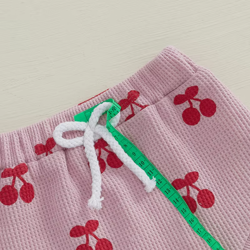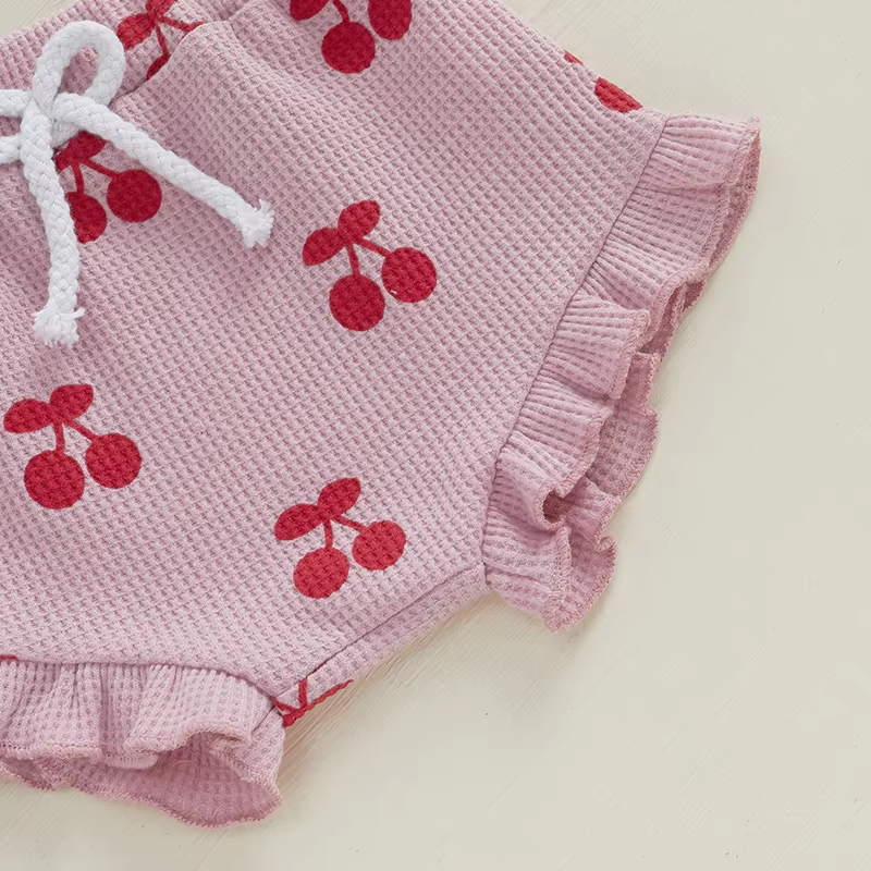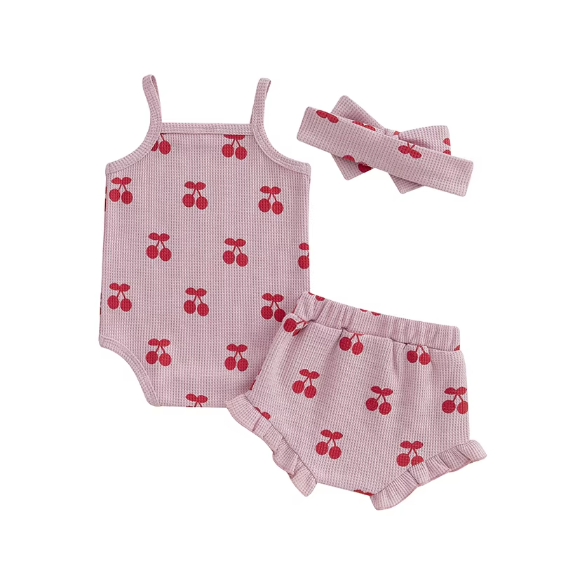 Baby Girls Summer Shorts Outfits Sleeveless Cherry Print Romper Drawstring Shorts Headband Sets
