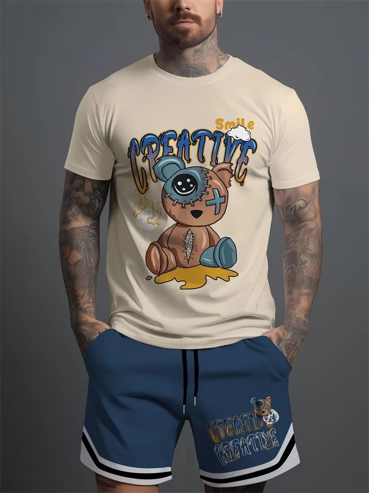 Interesting Cartoon 3D Printed Men's Round Neck Short Sleeve 2pcs Suit Urban Street Trend Men's Short Sleeve Top Trend Fashion