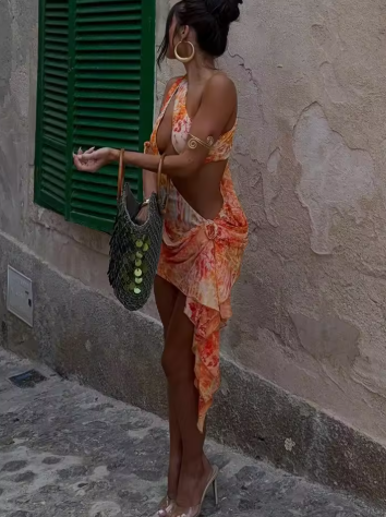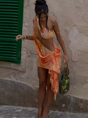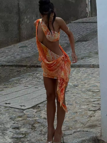 kliou Tie Dye Women Mini Dress Stunning Sexy Incline Shoulder Hollow Cleavage Appliques Tassel Bodycon Mujer Coquette Y2K Frock