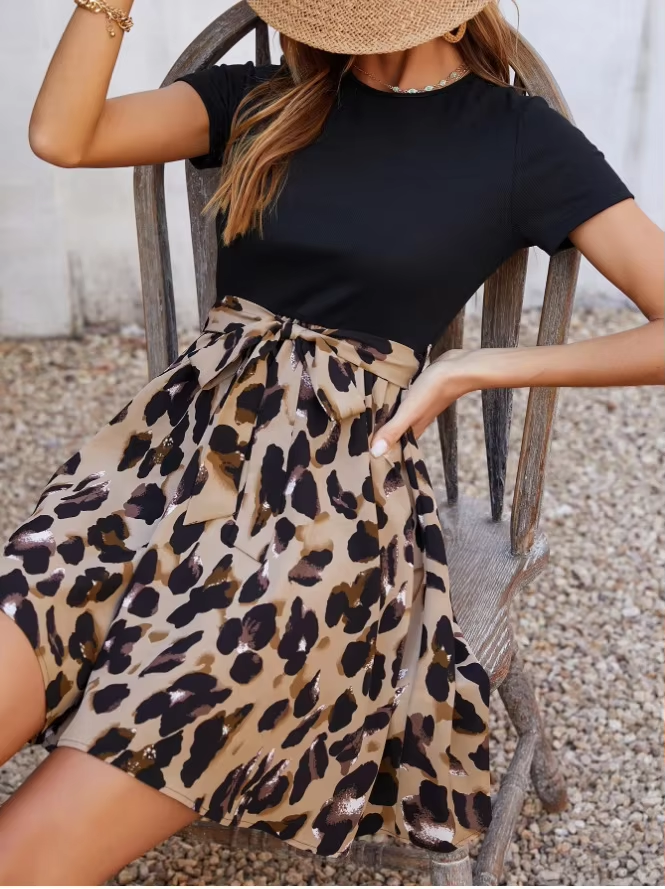 Ladies Leopard Print 2025 Summer New Dress Black Round Neck Short Sleeves Patchwork Printed Strap Bow Foreign Style Mini Dresses