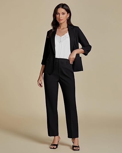 • Two piece sets for women dressy consist of a 3/4 ruffled sleeve blazer that with notch lapels, one button closure, lined and matching pants that with high rise, straight leg, front zipper with hook-and-bar and button closure creased at front legs.