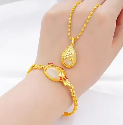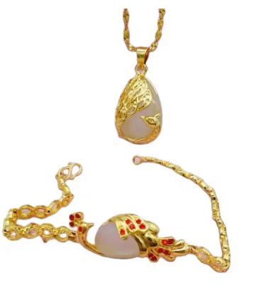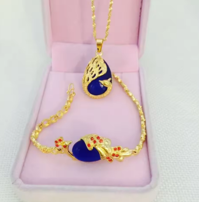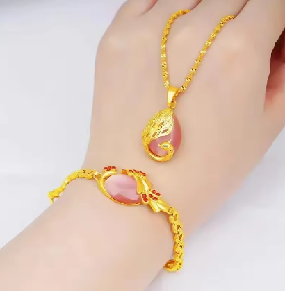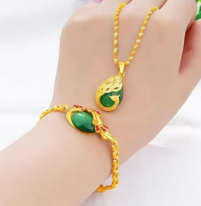 Luxury 24K yellow gold 9999 real gold Ladies Necklace Bracelet Peacock two-piece Pendant Cat's Eye AU750 Gold jewellery