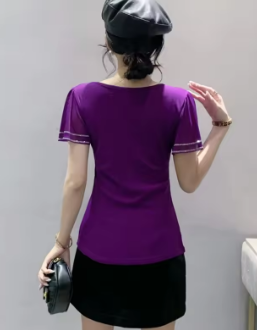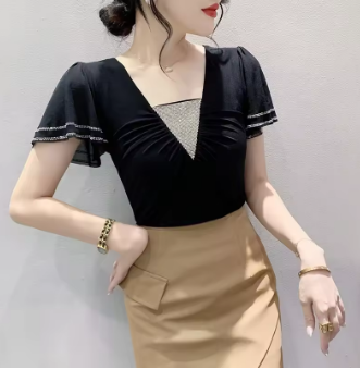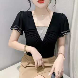 New Summer European Clothes Women's T-Shirt Chic Sexy V-Neck Hot Diamonds Tops Fashion Girl Ruffles Sleeve Casual Mesh Tees