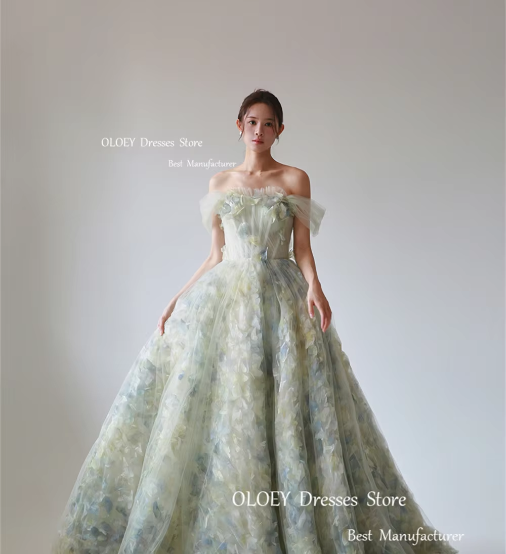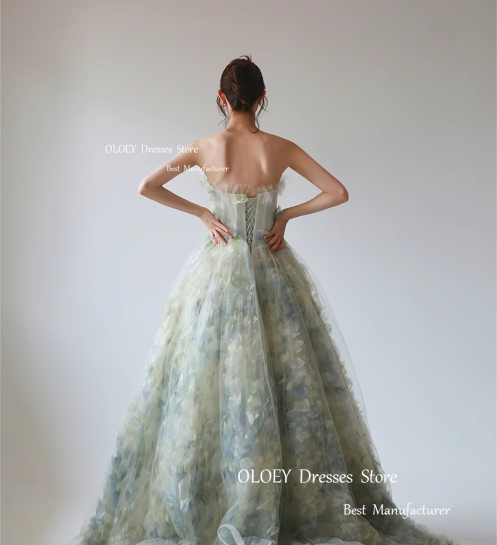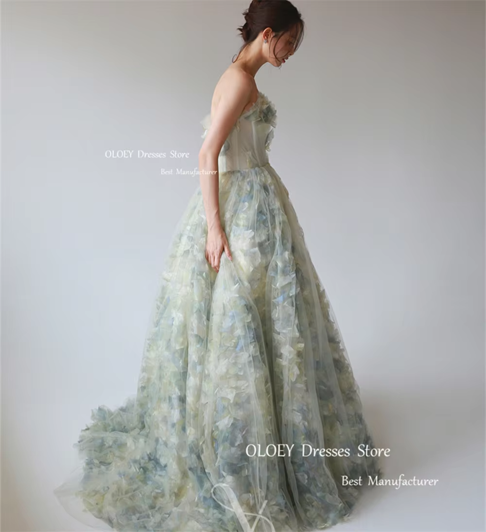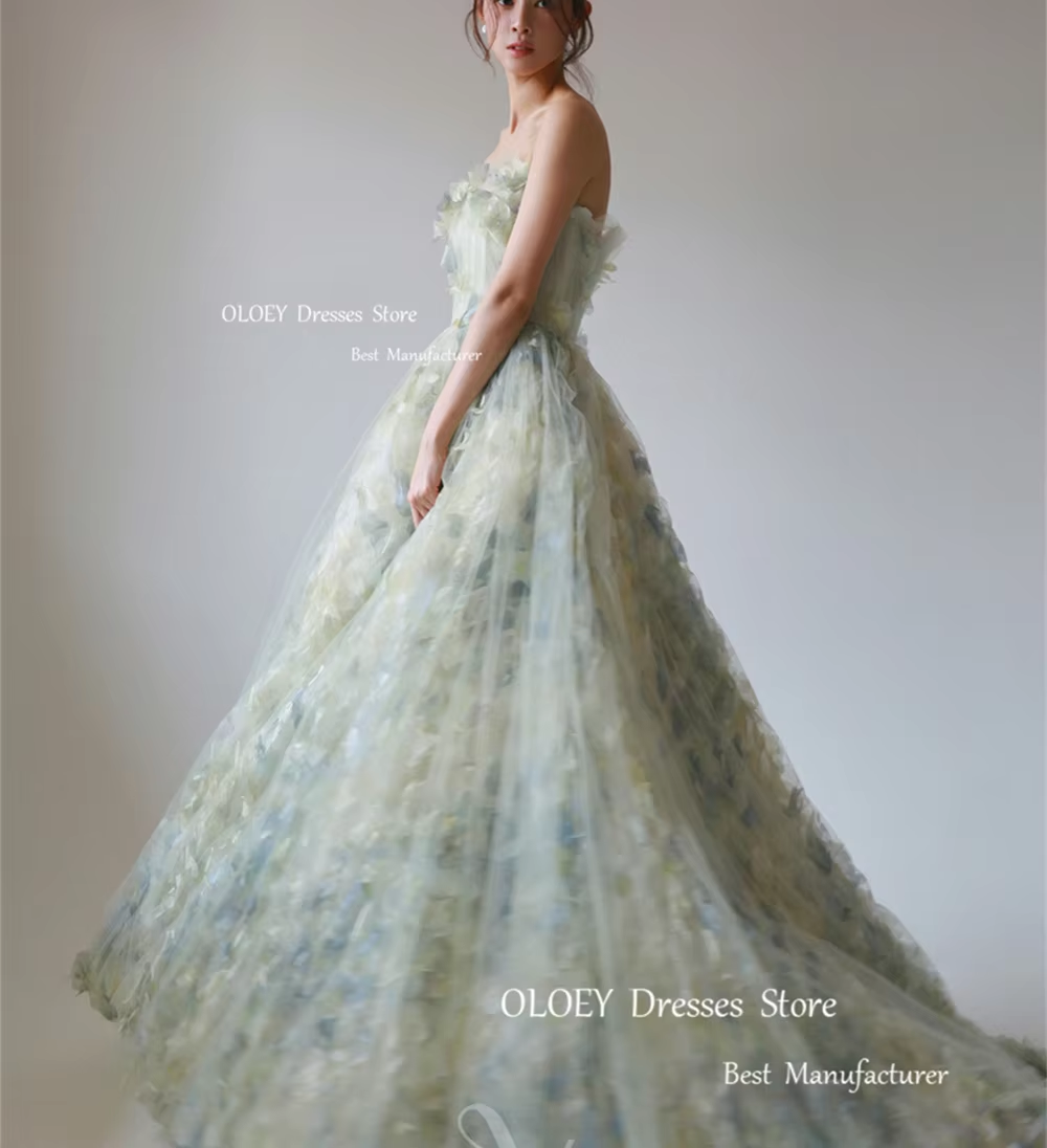 OLOEY Elegant Korea Evening Dresses 3D Flowers Strapless Floor Length Wedding Party Dress Customized Garden Photoshoot Prom Gown