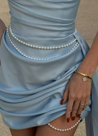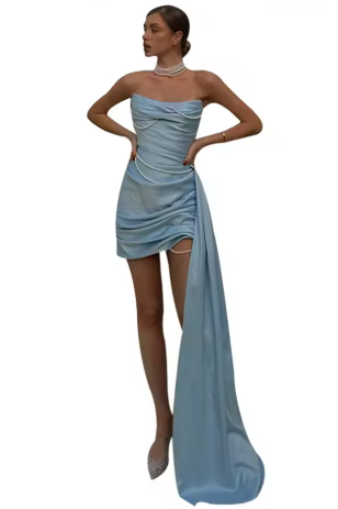 Pearl Pleated Strapless Dress Woman Sleeveless Waist Cinching Solid Color Ribbon Short Dresses Elegant Women Evening Party Dress
