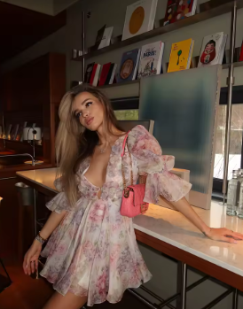 Pink Printed Chiffon Short Dress Women Fashion Flower Half Puff Sleeve V Neck Layered Vestidos High Waist A Line New Short Robes