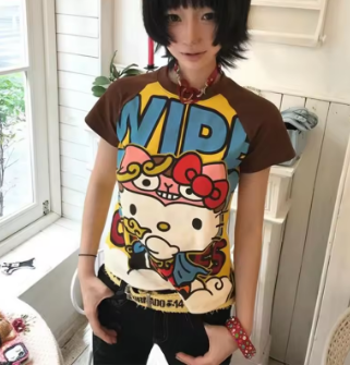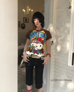 Sanrio Hello Kitty American Style Spicy Girl Tees Contrasting Color Women Summer Short Sleeved T-shirt Korean Version Trend Top