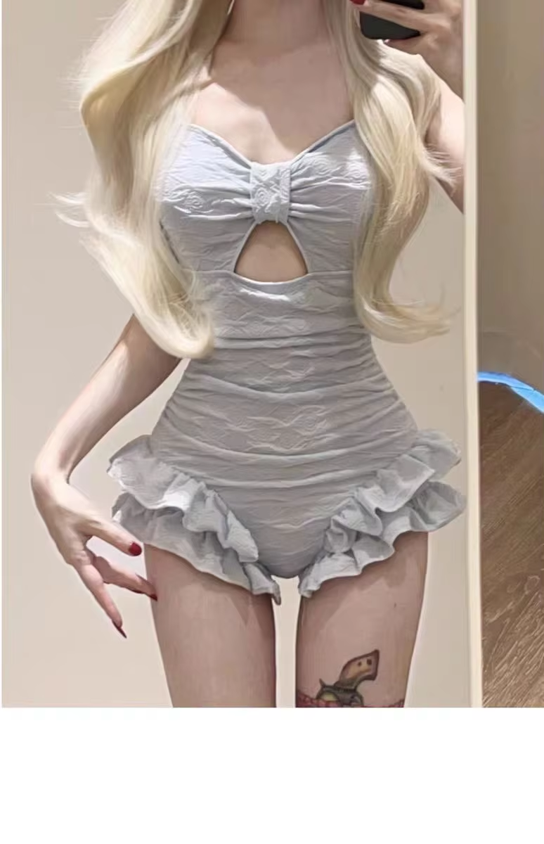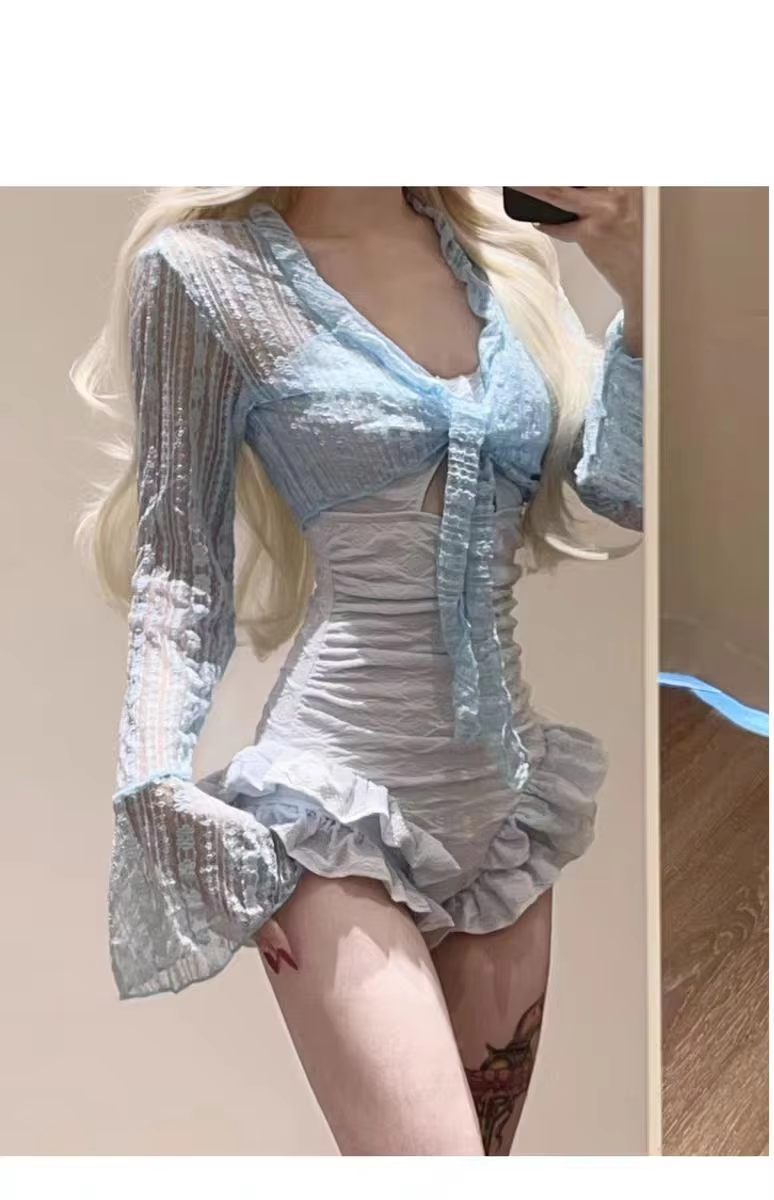 sexy Korean fashion conservative swimsuit two pieces ruched knot ruffles bodysuits bikinis with white blue mesh cover smock