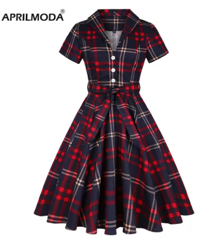 Spring Summer Retro Vintage Women Dress Plaid Printed England Style Large Size Shirt Sundress 50s 60s Pinup Swing Casual Dresses