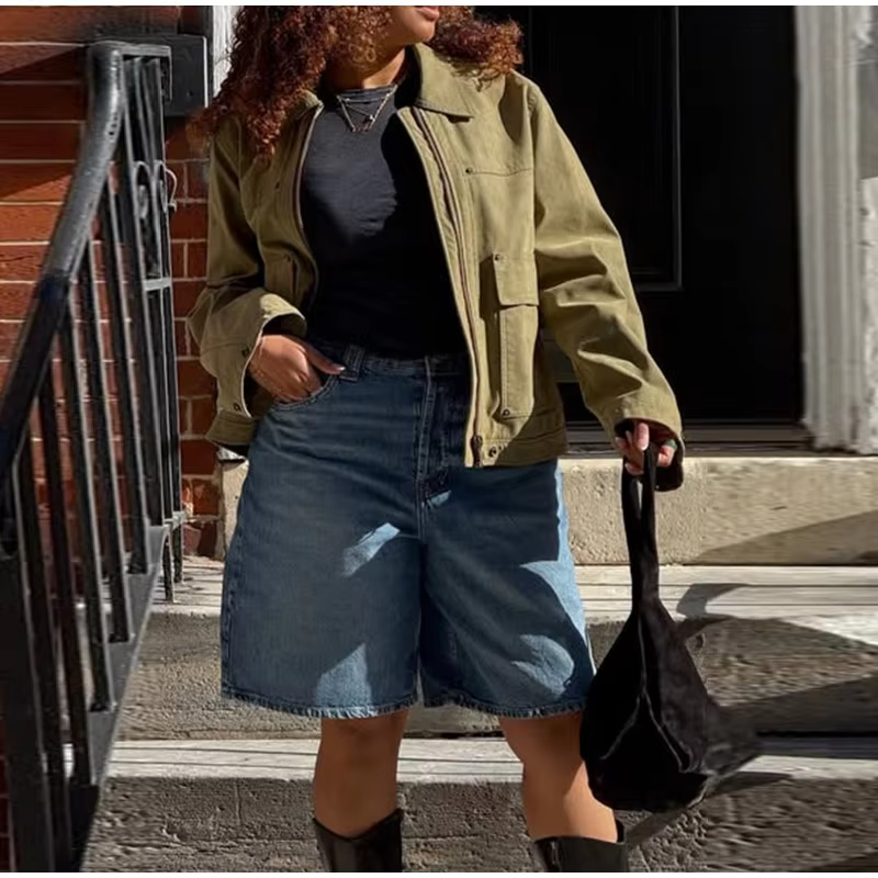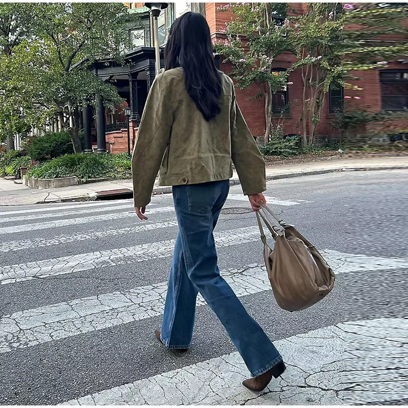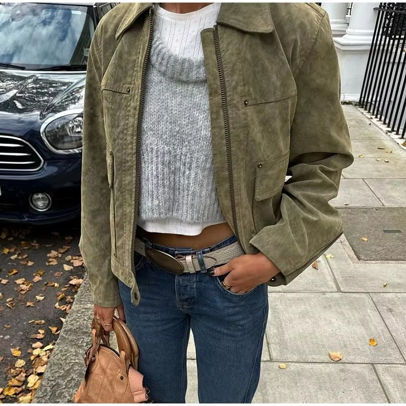 Street Green Suede Jackets Loose Lapel Long Sleeves Zipper Big Pockets Coats Female 2025 Spring New Fashion Chic Outwears Lady