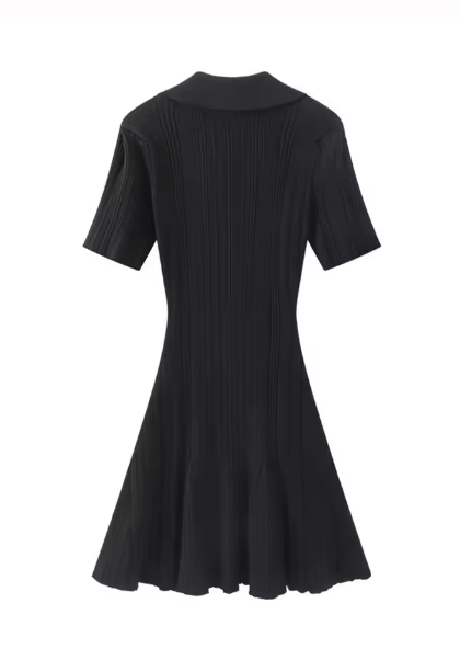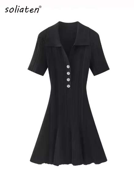 Summer New Women's Turn Down Collar Short Sleeve Knitted Mini Dress Slim Fit A-line Diamond Buttons White Short Dress C-050