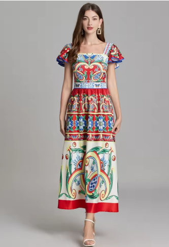 Summer Rumway Fashion Flower Print Long Dress Women Square Collar Flying Sleeve Elegant Backless High Waist Beach Party Vestidos
