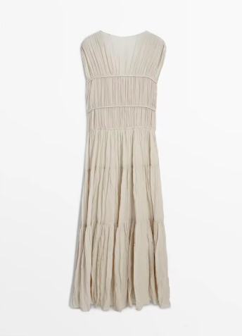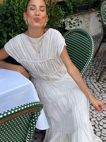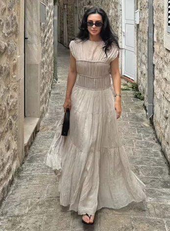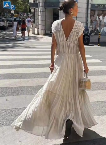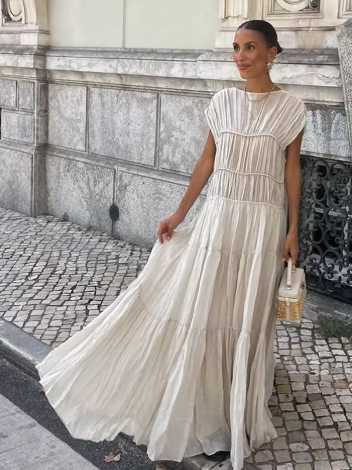 Vintage Solid Pleated Long Dresses Women Elegant Backless O-neck Short Sleeve Dresses Female Summer Spring Party Beach Holiday
