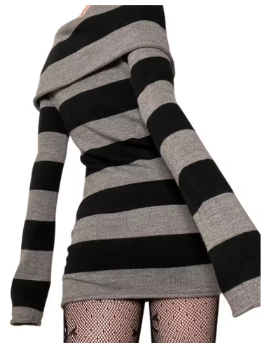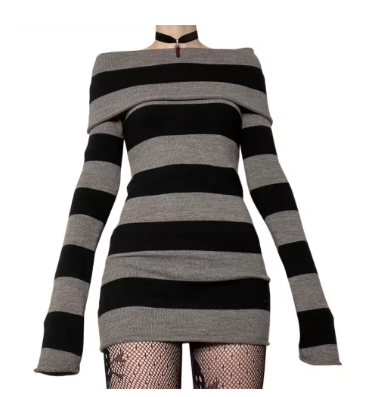Women Mini Bodycon Dress Stripe Boat-Neck Long Sleeve Short Dress Spring Autumn Wrapped Hip Party Dress