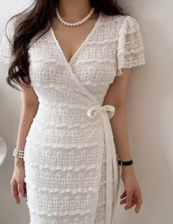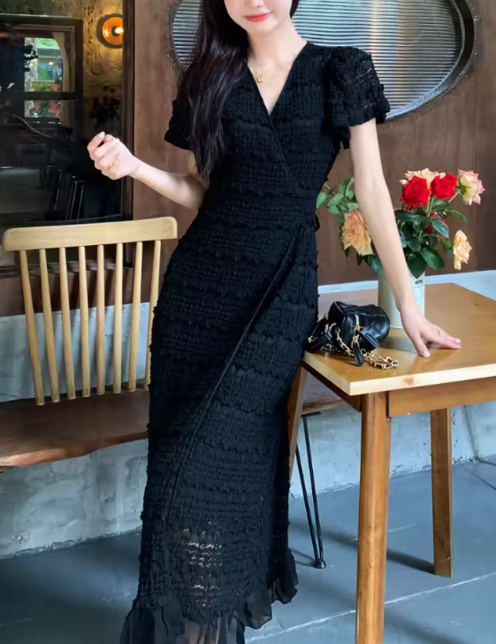 Women Elegant Bodycon Dress Summer Sexy V-neck Short Sleeve Korean Long Dresses Ladies Vintage Solid White Black Long Robe