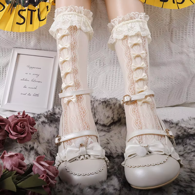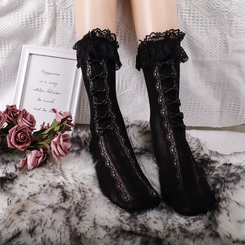 Women Lolita Hollow-out White Lace Edge Middle Tube Pile Up Socks Japanese Cos Jk Princess Bowknot Thin Fishnet Mesh Calf Socks