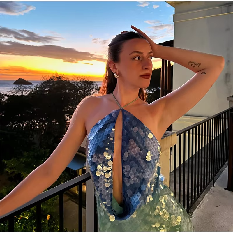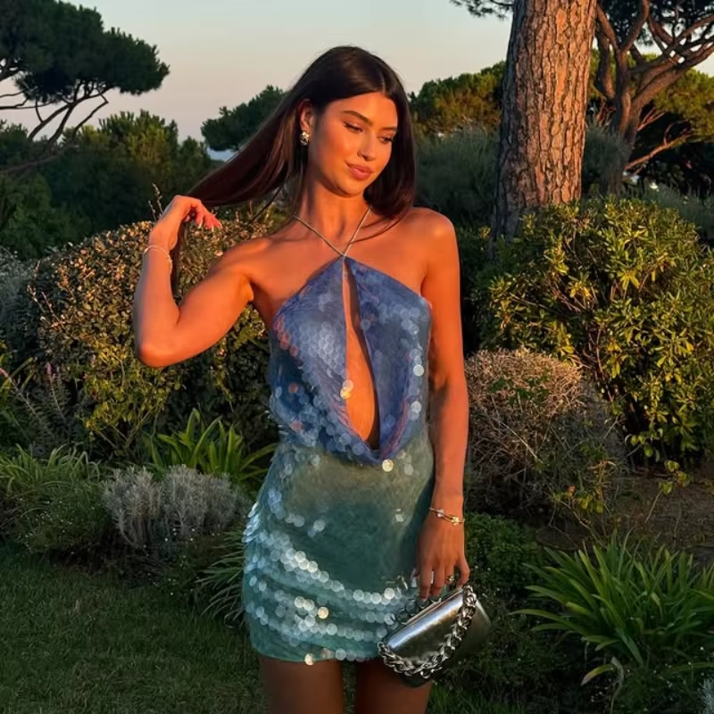 Women Sexy Glitter Sequin Blue Mini Dress Chic Round Neck Slim Fit Backless Sleeveless Halter Dresses Summer Fashion Lady Robes