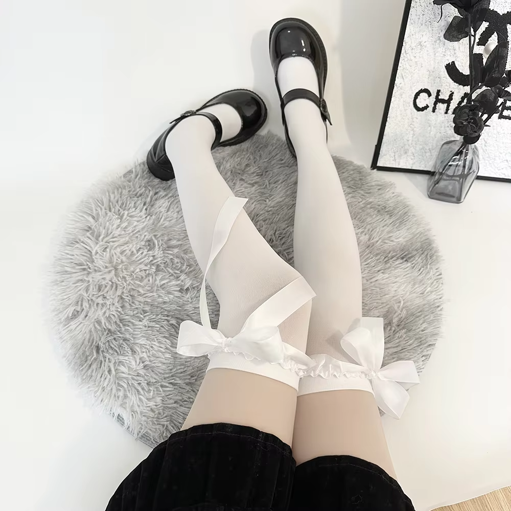 Women's Delicate Bow Velvet Thigh High Stockings Spring Summer Soft Lolita Lace-trimmed Bow Ribbon Jk Thin Over-the-knee Socks