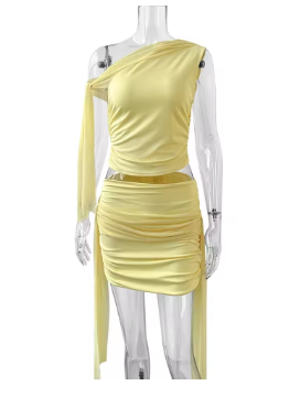 Women's Elegant Temperament Pleated Top and Short Skirt Set, Solid Color Net Sand Diagonal Shoulder Strap, Summer Beach Ou, New