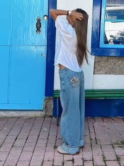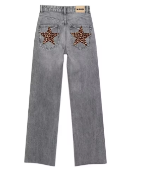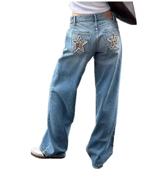 Women's High Waist Straight Leg Denim Jeans With Leopard Print Star Patch Trendy Streetwear Washed Blue Pants Vintage Trousers