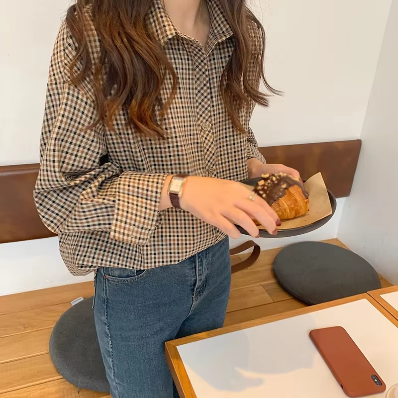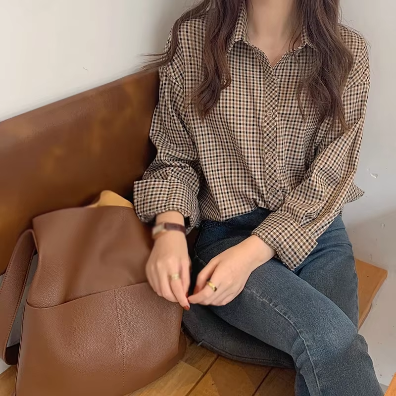 Women's Spring Autumn Chic Plaid Shirt New French Style Retro Elegant Social Long Sleeved Layered Shirt Y2k Vintage Top